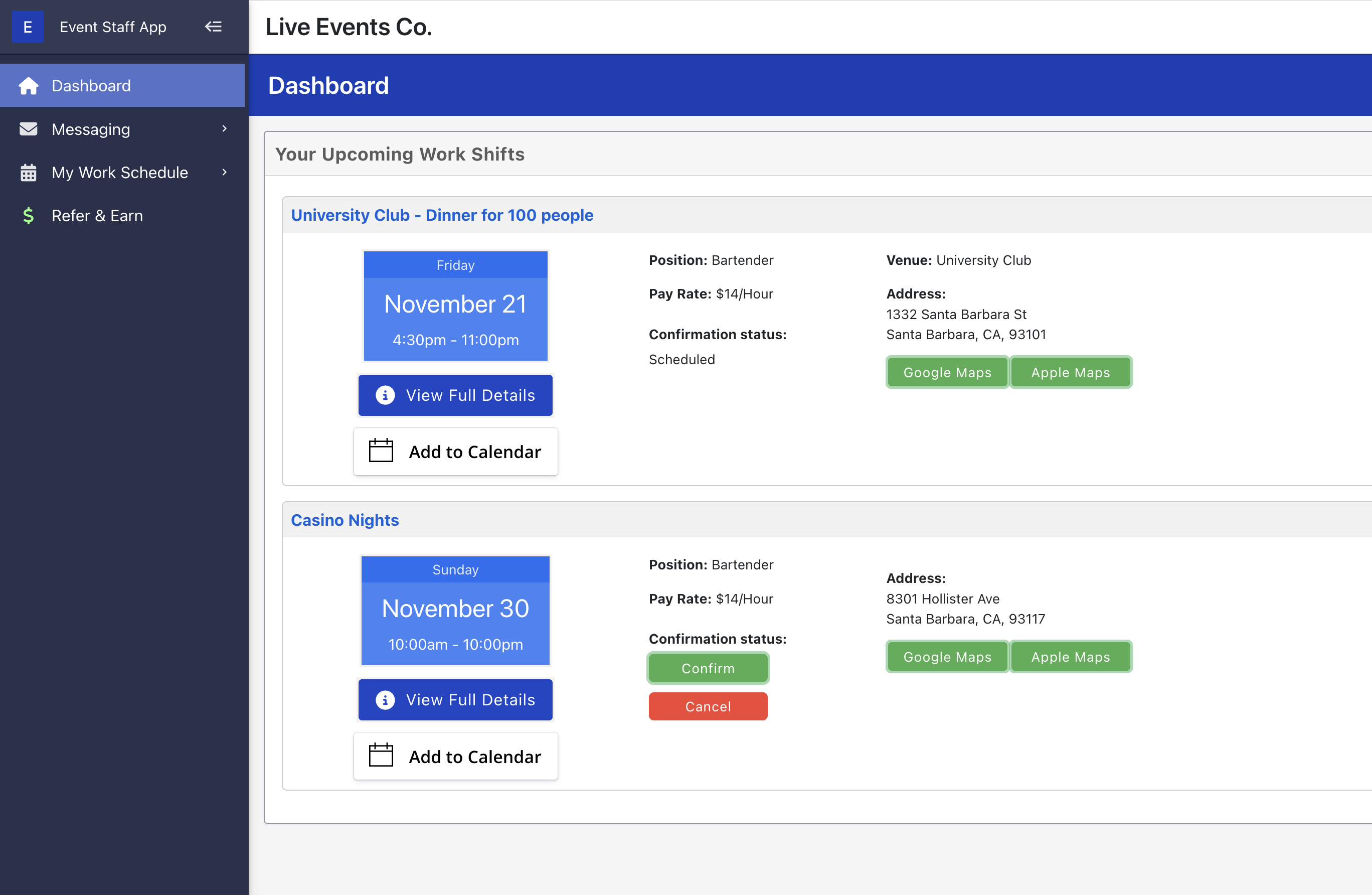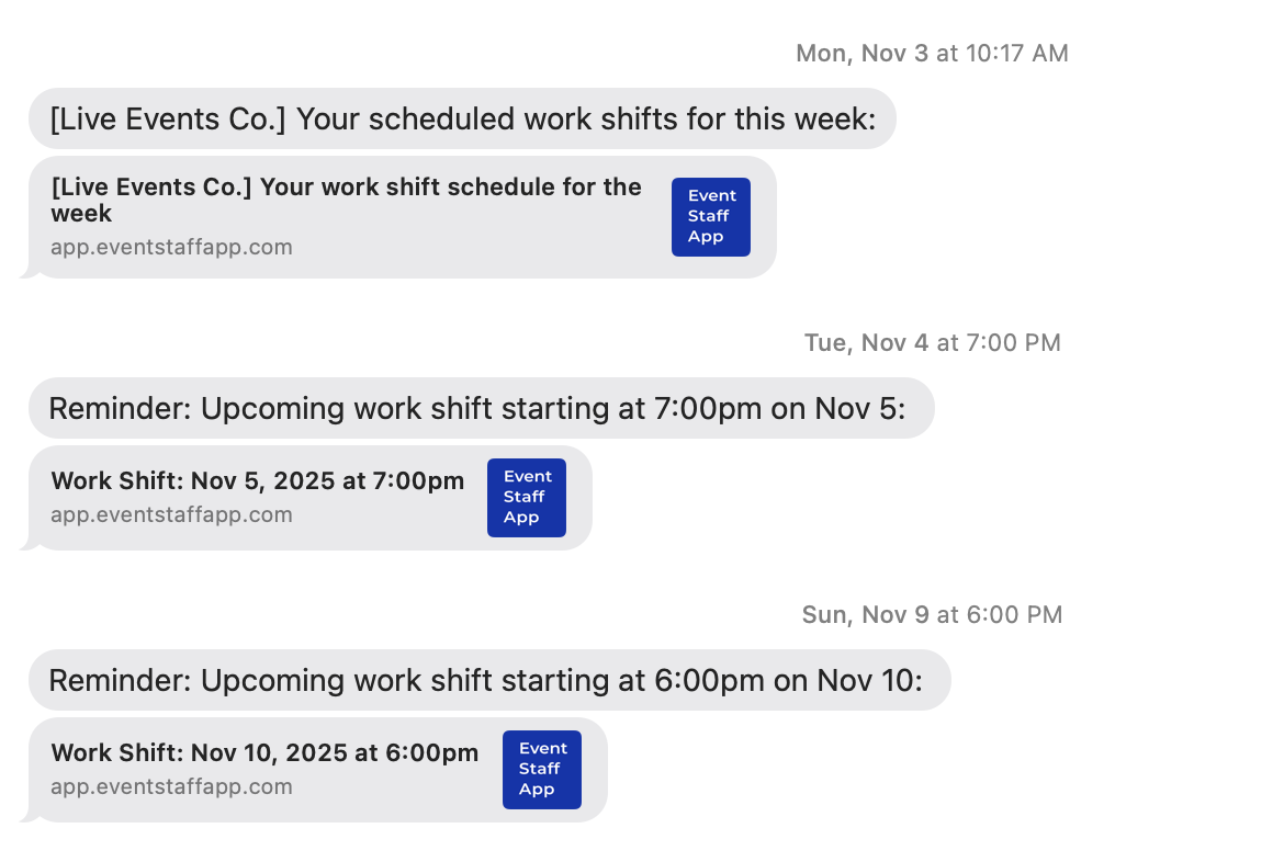 When you are chosen to work an event, your manager will send you a work shift that will come as both a mobile text message and email. You can also log in at any time with your account to view the events that you are scheduled to work at.