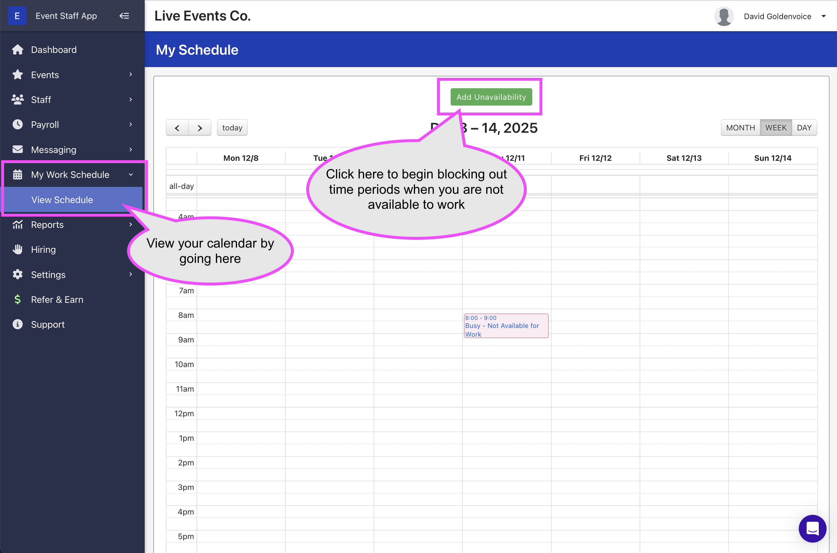 You can block out time periods when you are not available to work by going to My Work Schedule > View Schedule, and then using the Add Unavailability button. By doing so, you will let your manager know the times that you are not free to work.